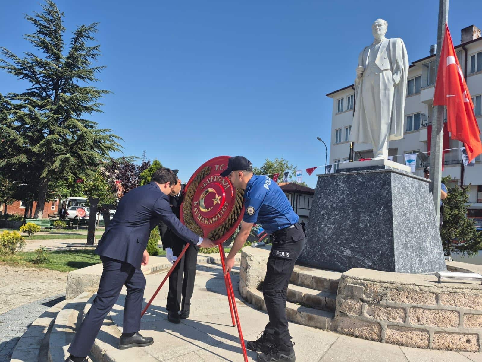30 Ağustos Zafer Bayramı kutlamaları Cumhuriyet Meydanındaki Atatürk Anıtı'na çelenk sunumu ile başladı. Çelenk Sunma törenine İlçe Kaymakamımız Sayın Abdülkadir ZENGİN, Belediye Başkanı Sayın Uğur TEPE, İlçe Milli Eğitim Müdürümüz Sayın Muhammed Rıdvan Eser, protokol üyeleri ve vatandaşlar katılım sağladı. Günün anlam ve önemine dair konuşmaların ardından İlçe Kaymakamımız Sayın Abdülkadir ZENGİN'in makamında tebrikleri kabul etmesiyle kutlama programı sona erdi.